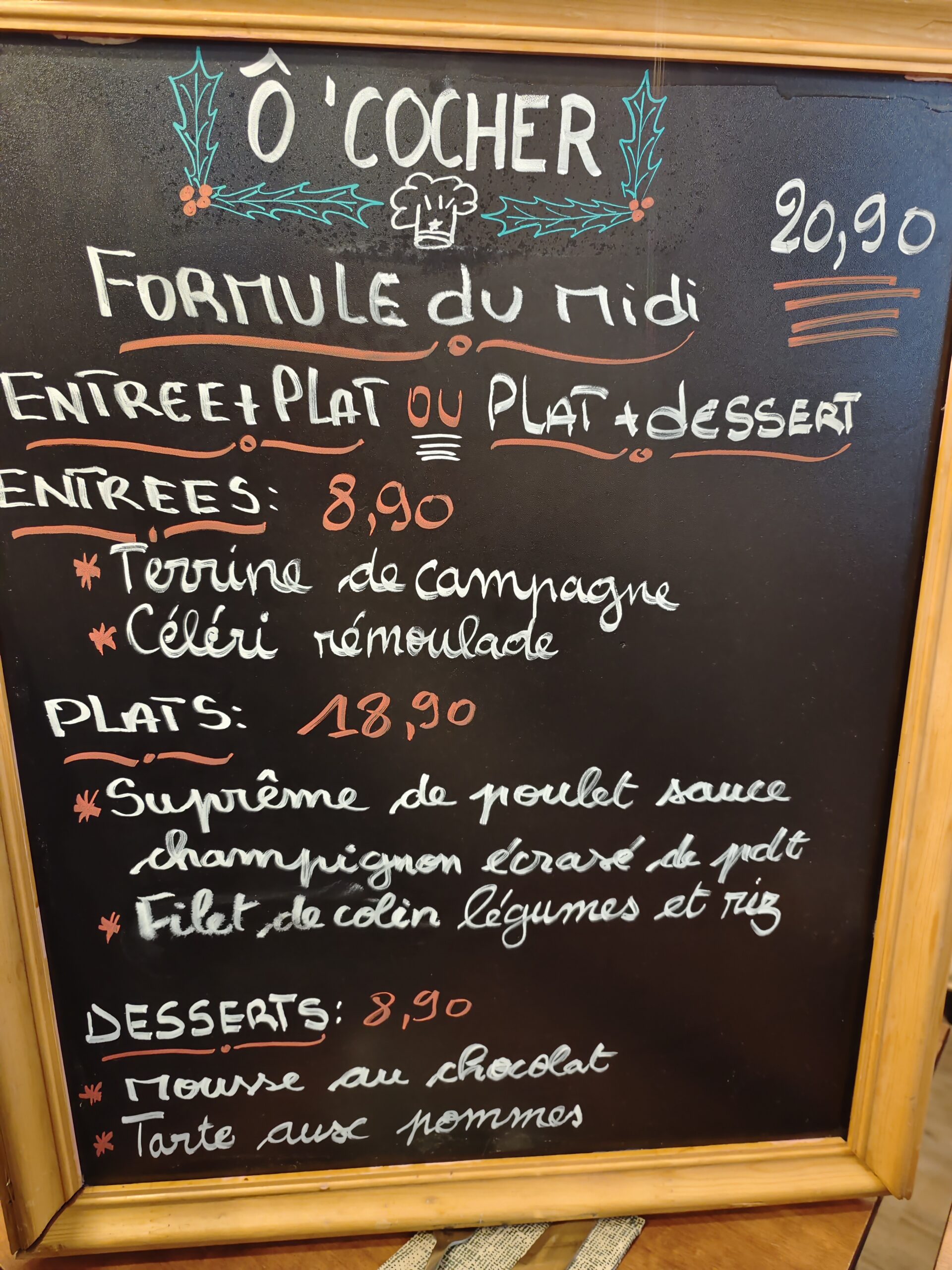 Voici la carte en date de novembre 2025 ainsi que la carte du jour de ma visite. Comptez ainsi 20.90€ pour la formule du midi entrée+plat ou plat+dessert. La carte complète est à retrouver sur le site du restaurant.