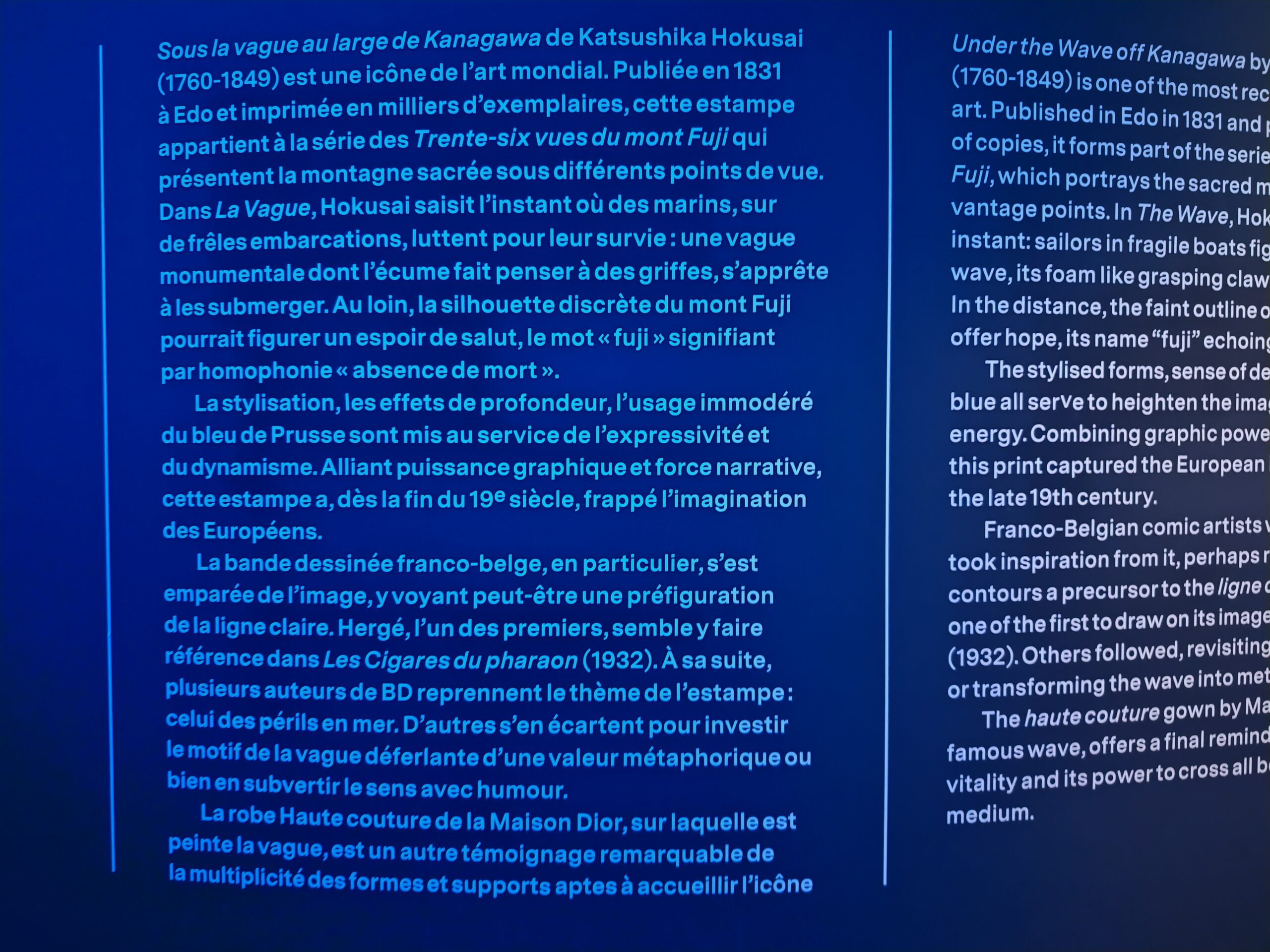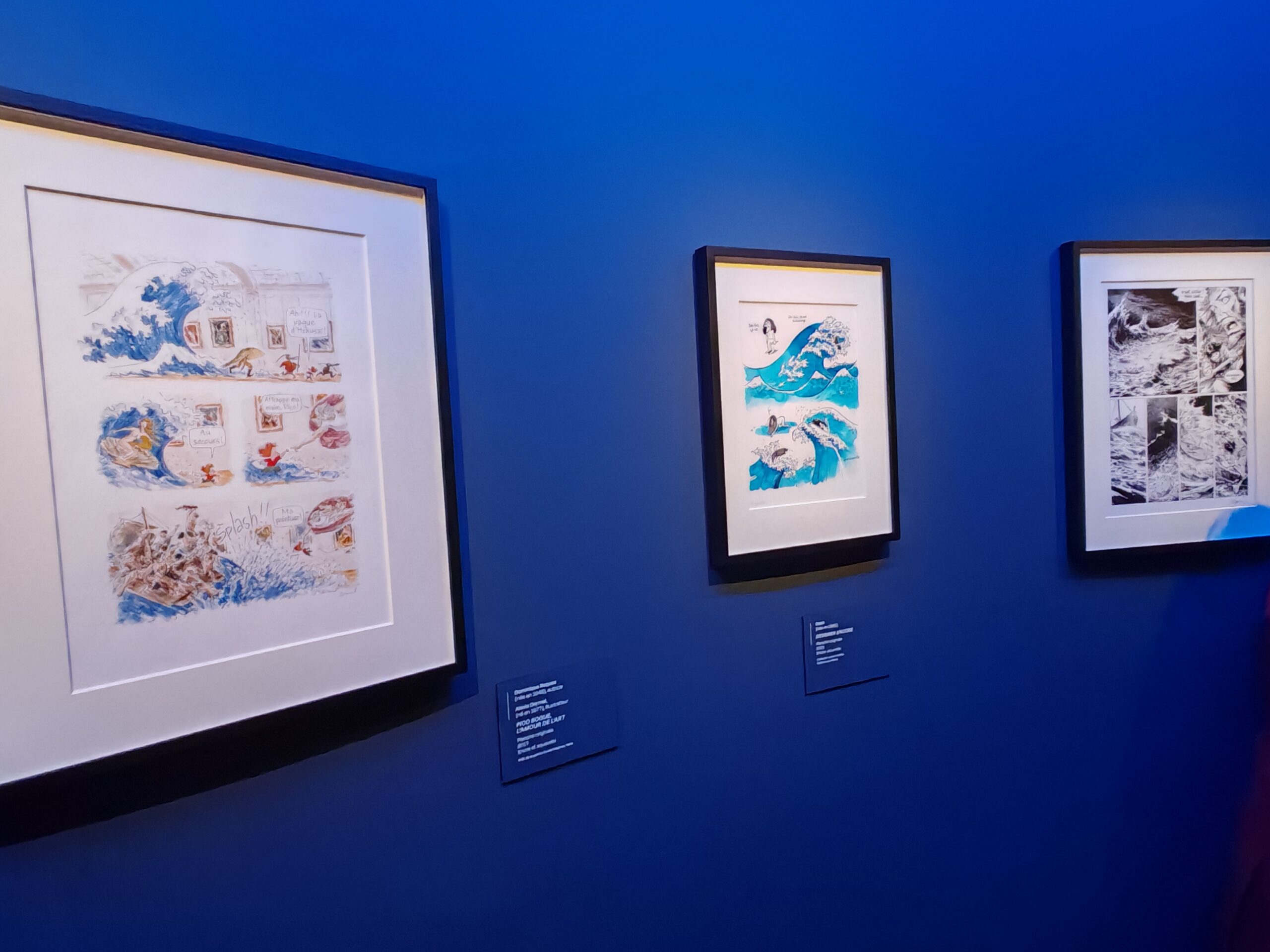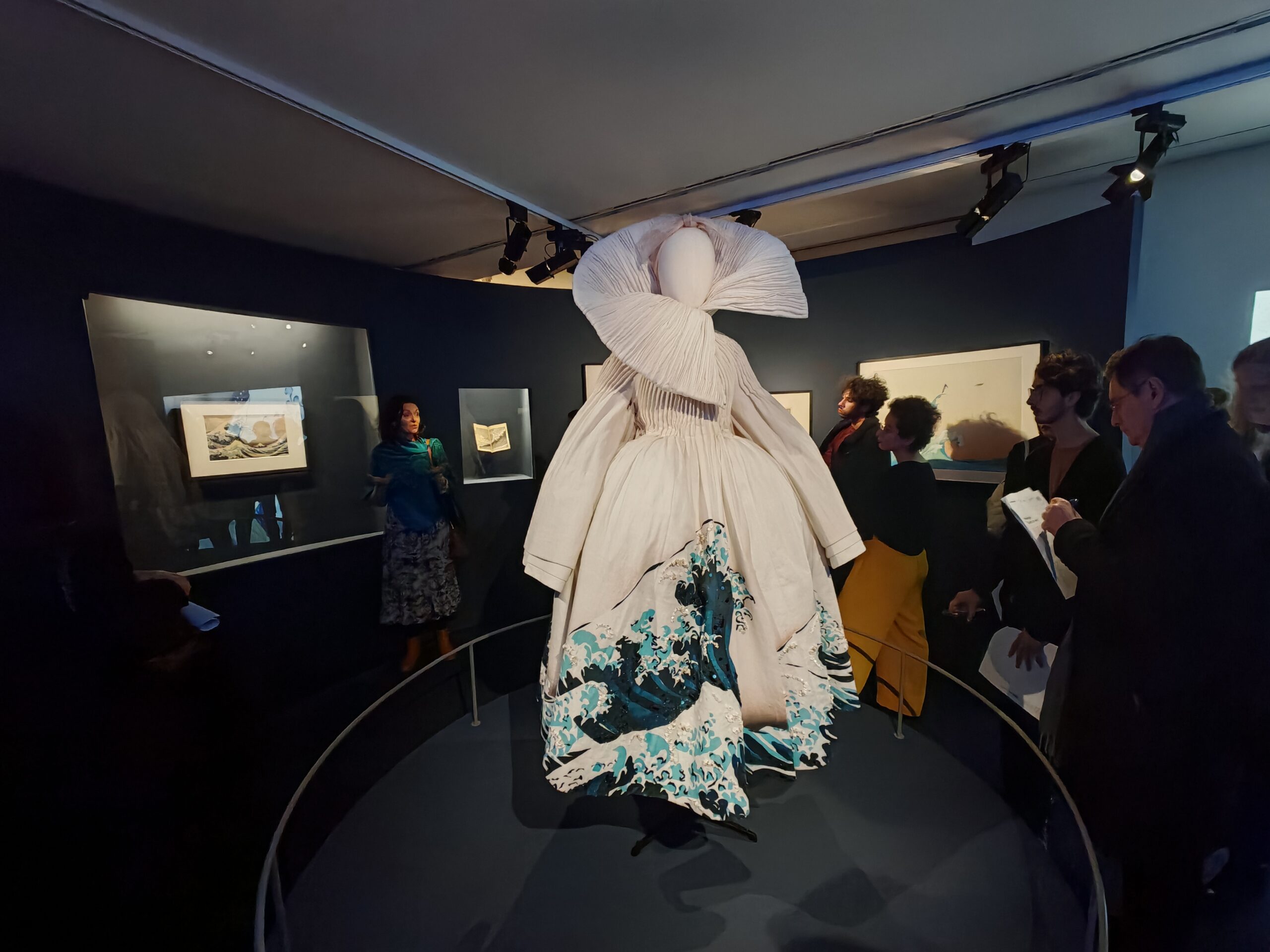 Une salle est dédiée à la mythique estampe Sous la grande vague au large de Kanagawa de Kanagawa d’Hokusai. A ses côtés, on retrouve diverses pages de BD autour de l’univers de la vague. Au centre de la pièce, on profite d’une sublime robe aux couleurs de la mythique oeuvre d’art.