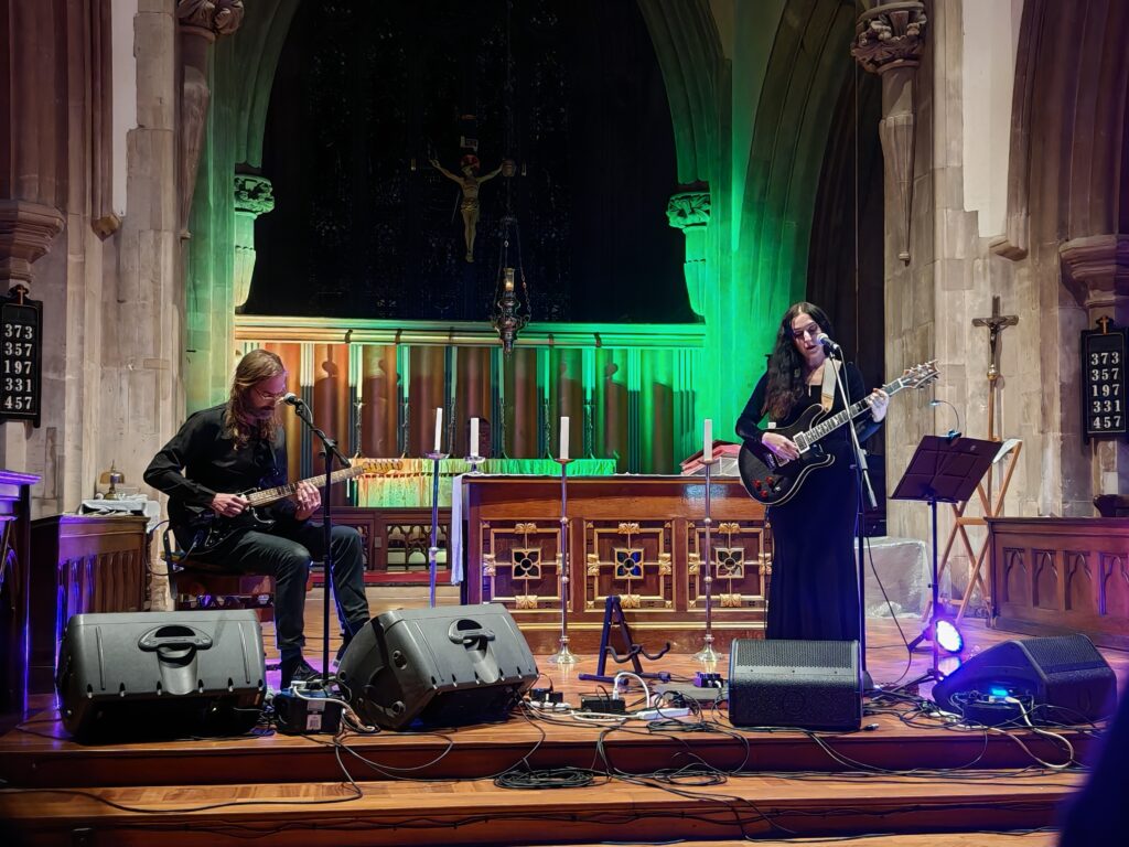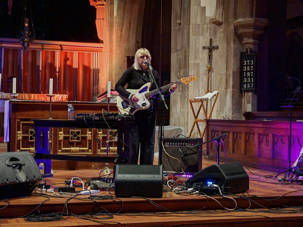 On retrouve un classique de l’artiste soliste : une jeune femme avec une guitare électrique et boîte à rythme avec mélodies pré enregistrées pour l’accompagner et créer un effet de groupe. L’avantage de l’église est que l’artiste n’a nullement besoin de backdrop puisque Jésus est là pour illustrer les lieux. De part et d’autre le public profite également de vitraux religieux. Bref, c’est un décor unique pour un concert atypique.