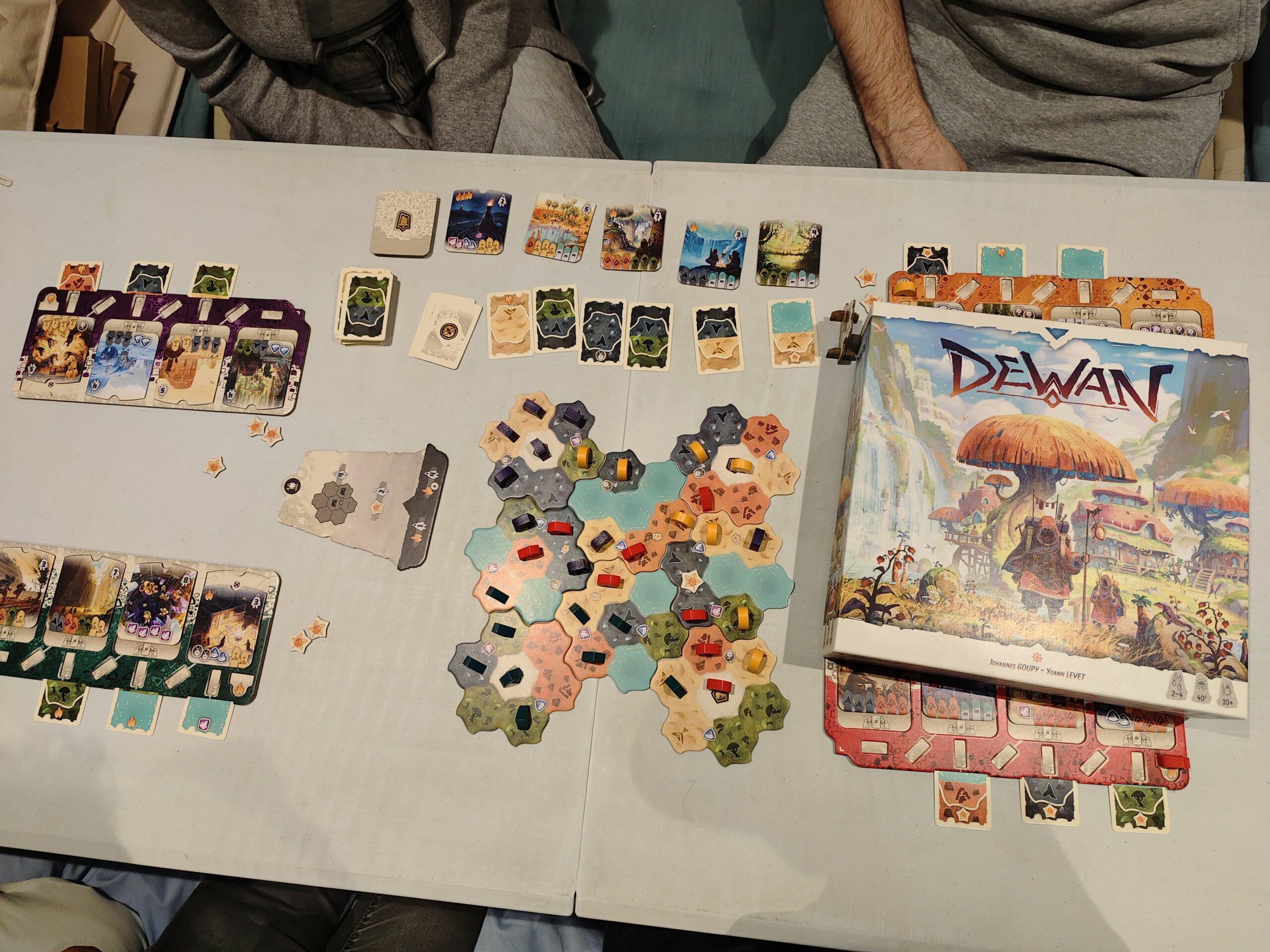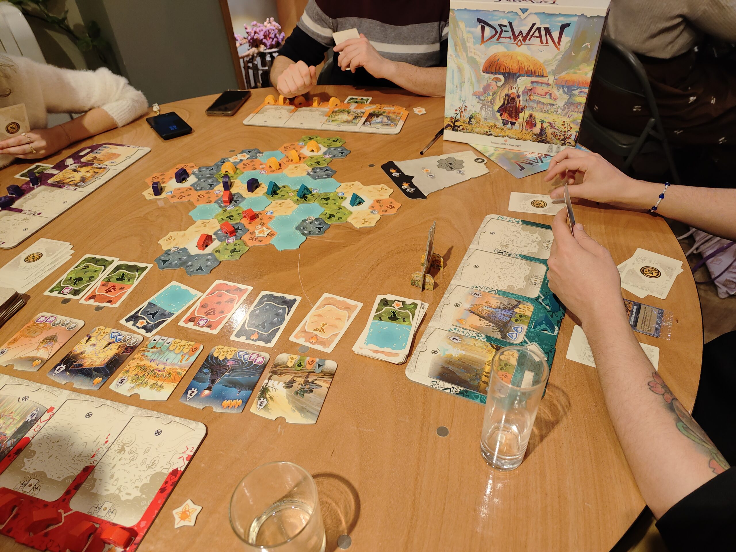 Il y a quelques semaines les équipes d’Asmodee m’ont fait la sympathie de m’inviter à une soirée présentant en avant-première le jeu de société Dewan. Le titre pour 2 à 4 joueurs est édité par Space Cowboys et est une création de Johannes Goupy, Yoann Levet et Arthus Pilorget. Après l’avoir testé il est temps de vous partager mon avis à son sujet.