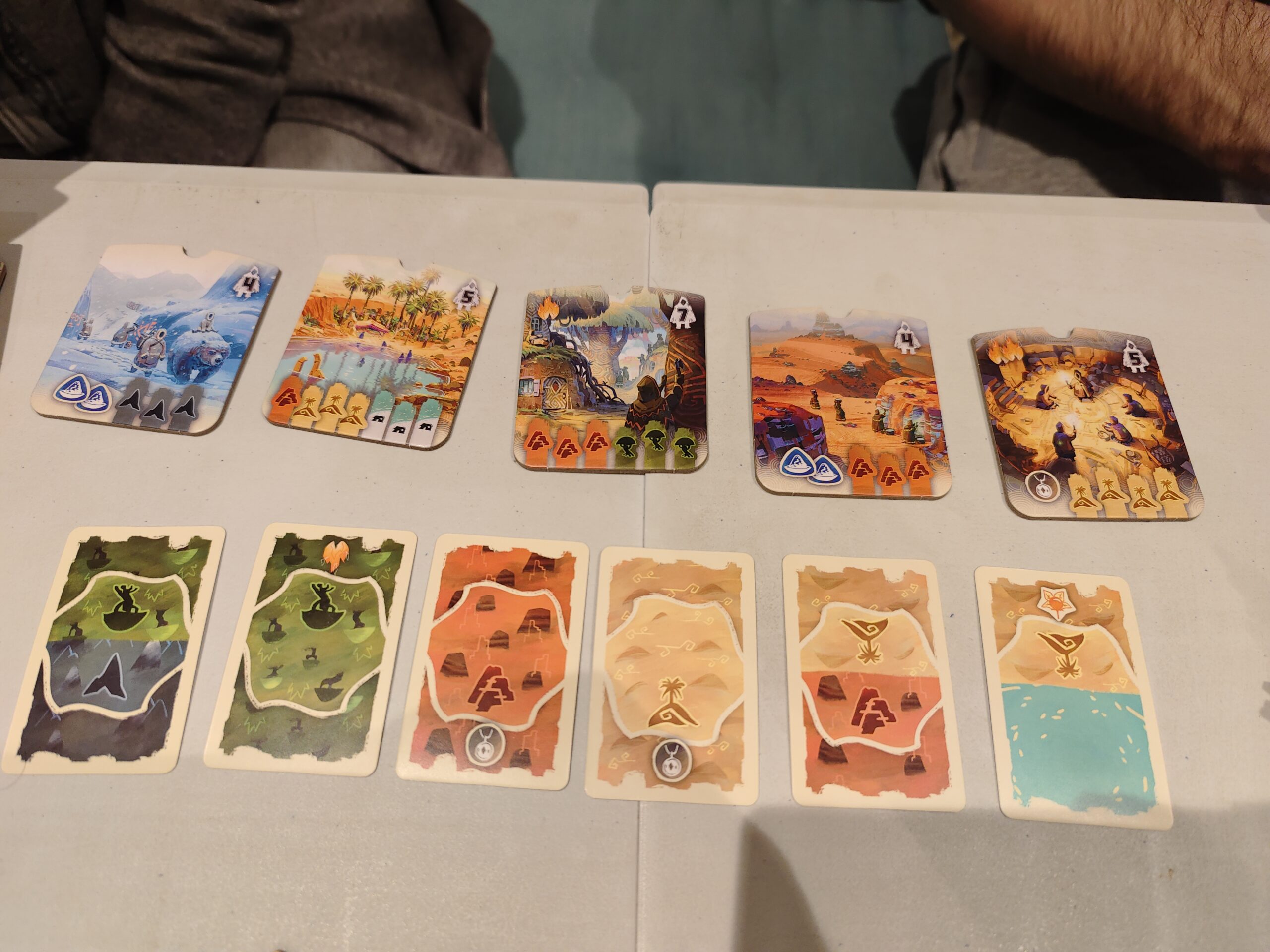 Dewan n’a que deux actions possibles : piocher deux cartes adjacentes parmi les six de la rivière ou poser un camp en dépensant les cartes piochées. Les cartes peuvent présenter un ou deux lieux (forêt, montagne…) et des éléments (baies, flamme, amulette…).