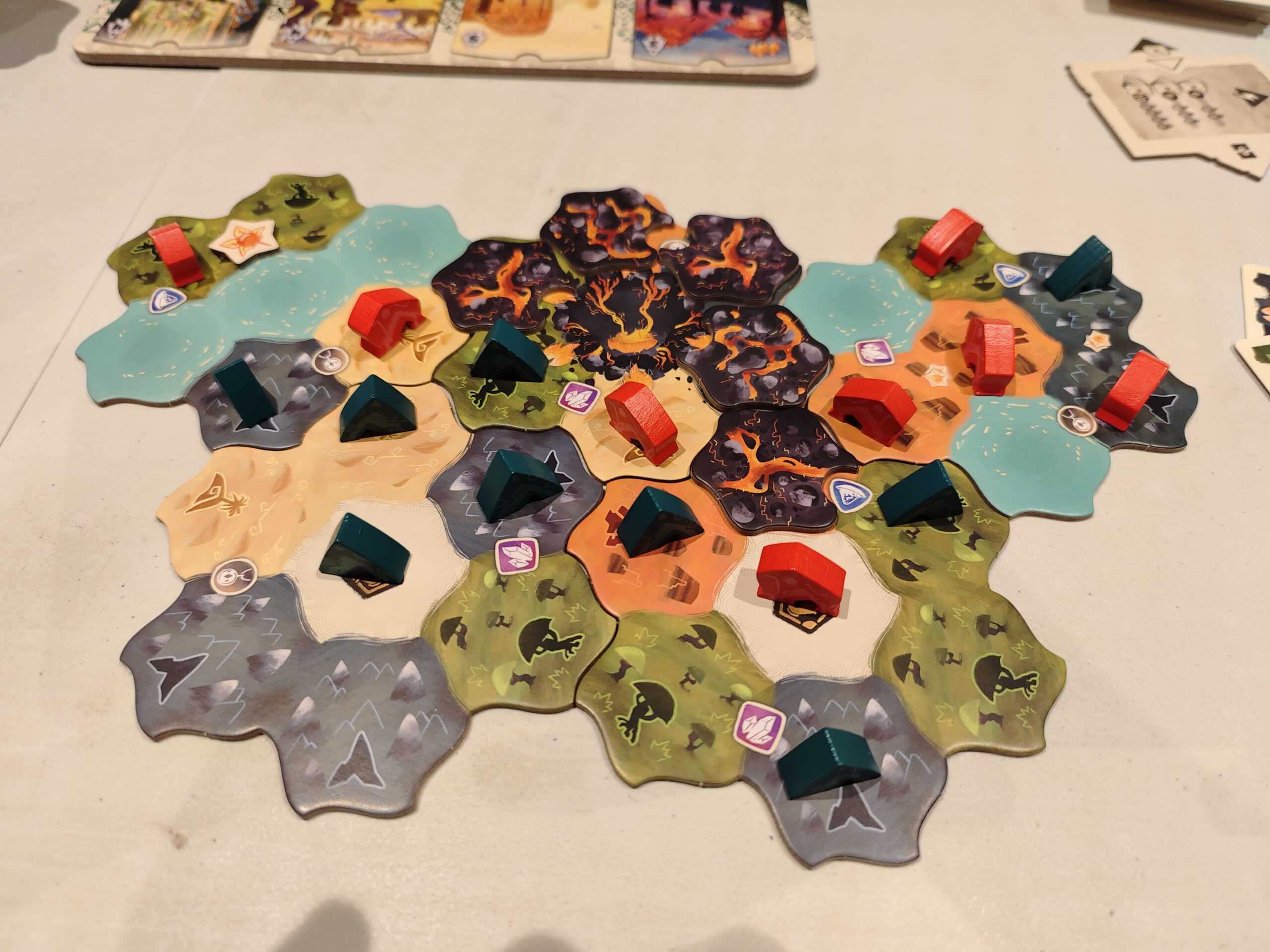 Du côté du volcan, on a une étendue de lave qui se propage toutes les 6 cartes piochées dans la rivière et qui bloque pleinement une nouvelle case adjacente au volcan/à l’étendue. A deux joueurs, cela réduit très fortement la carte.
