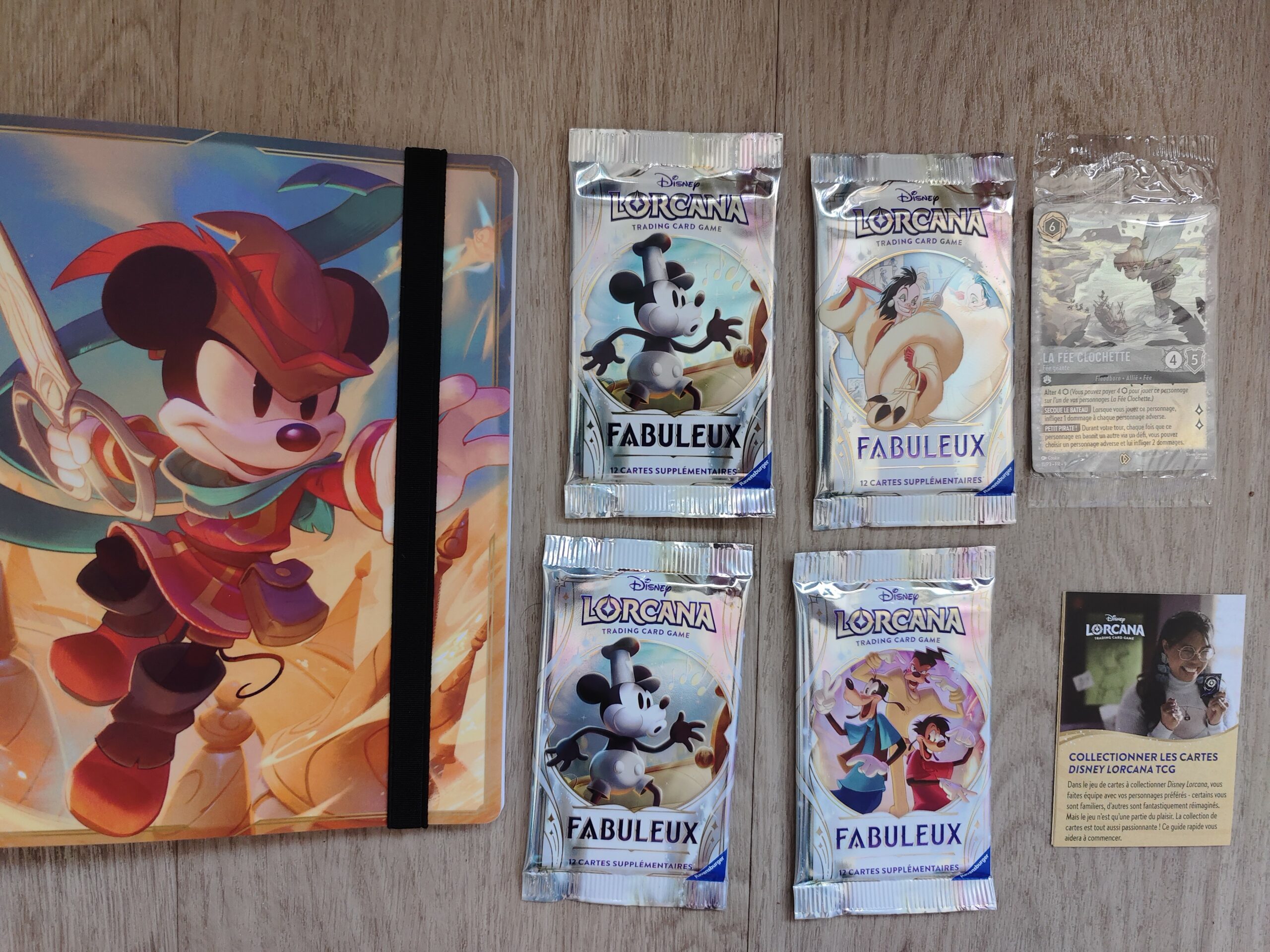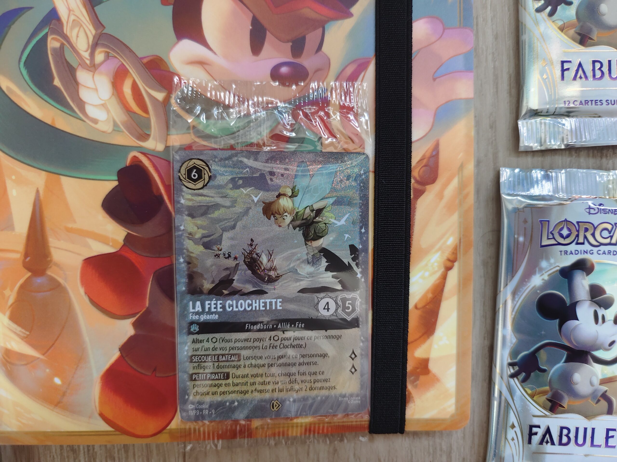 Au sein du petit carton on retrouve 4 boosters du dernier set sorti à ce jour, Fabuleux. J’ai d’ailleurs testé les decks préconstruits associés à ce set sur mon site. On y retrouve également une carte promotionnelle avec un effet de brillance exclusif de La fée Clochette.
