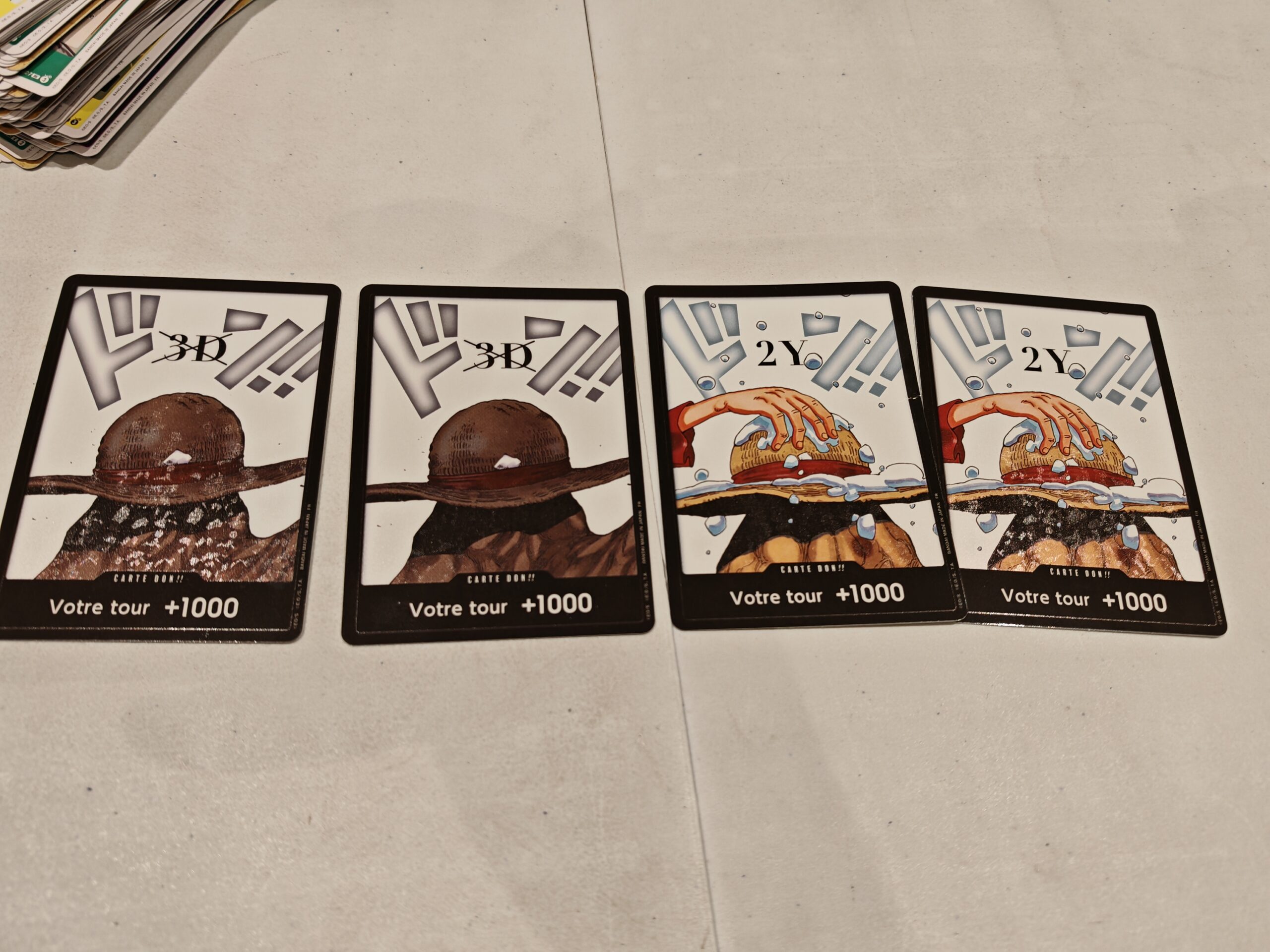 Concernant les cartes Don, j’ai eu 2 exemplaires différents en double. Les fans de la licence reconnaîtront d’ailleurs très bien les insignes 3D (barré) et 2Y présents sur les cartes. Sans aucun doute un des moments les plus marquants du récit d’Eiichiro Oda.
