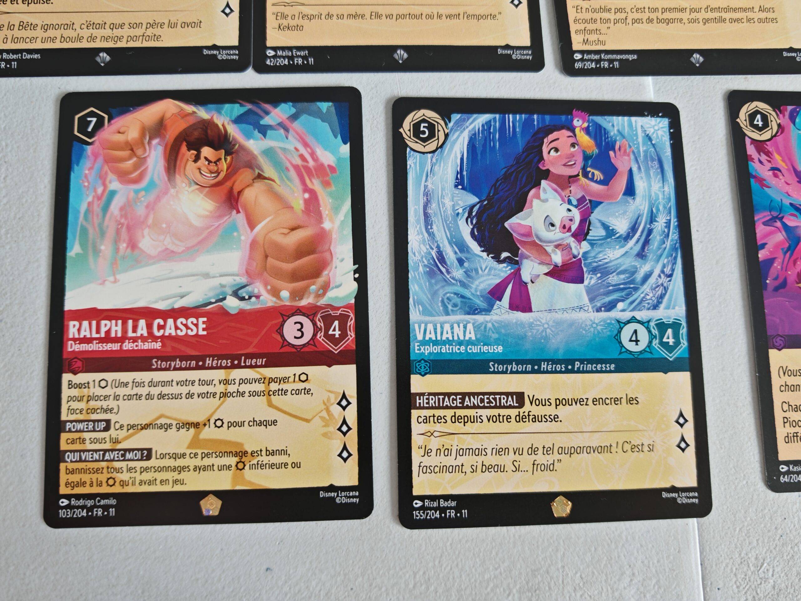 Parmi les cartes notables trouvées dans les boosters on peut parler de deux légendaires : Vaiana et Ralph la Casse.