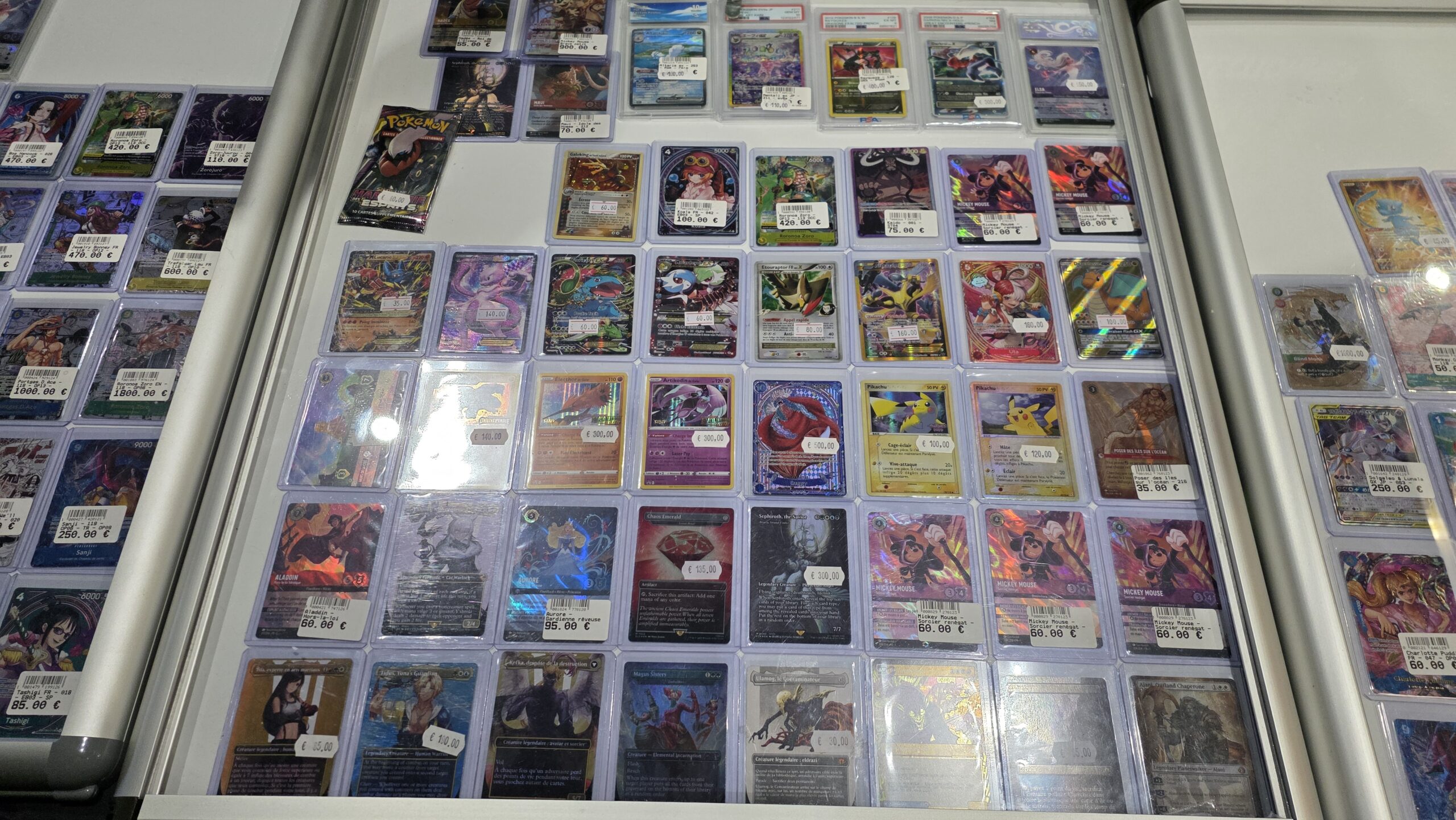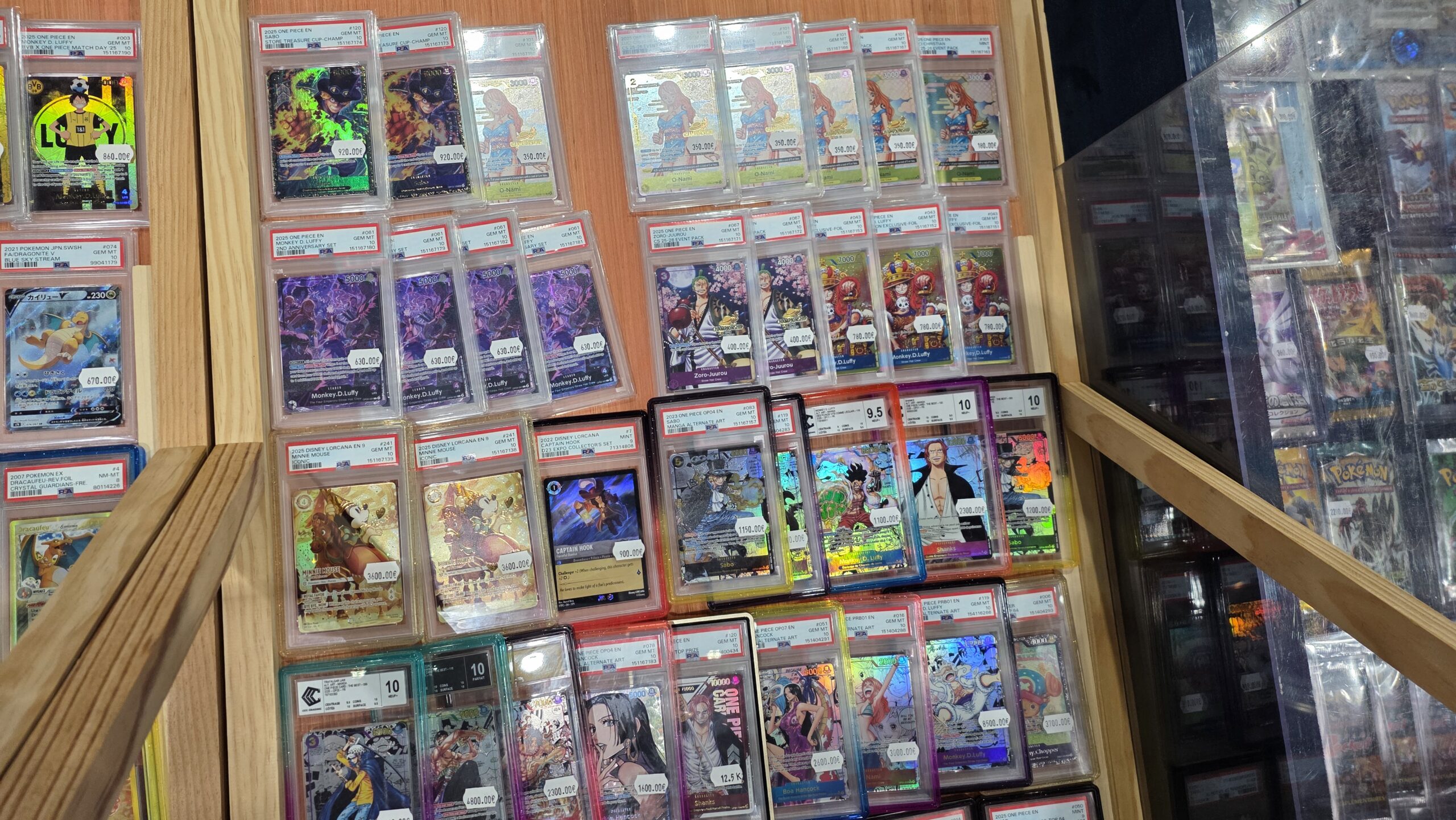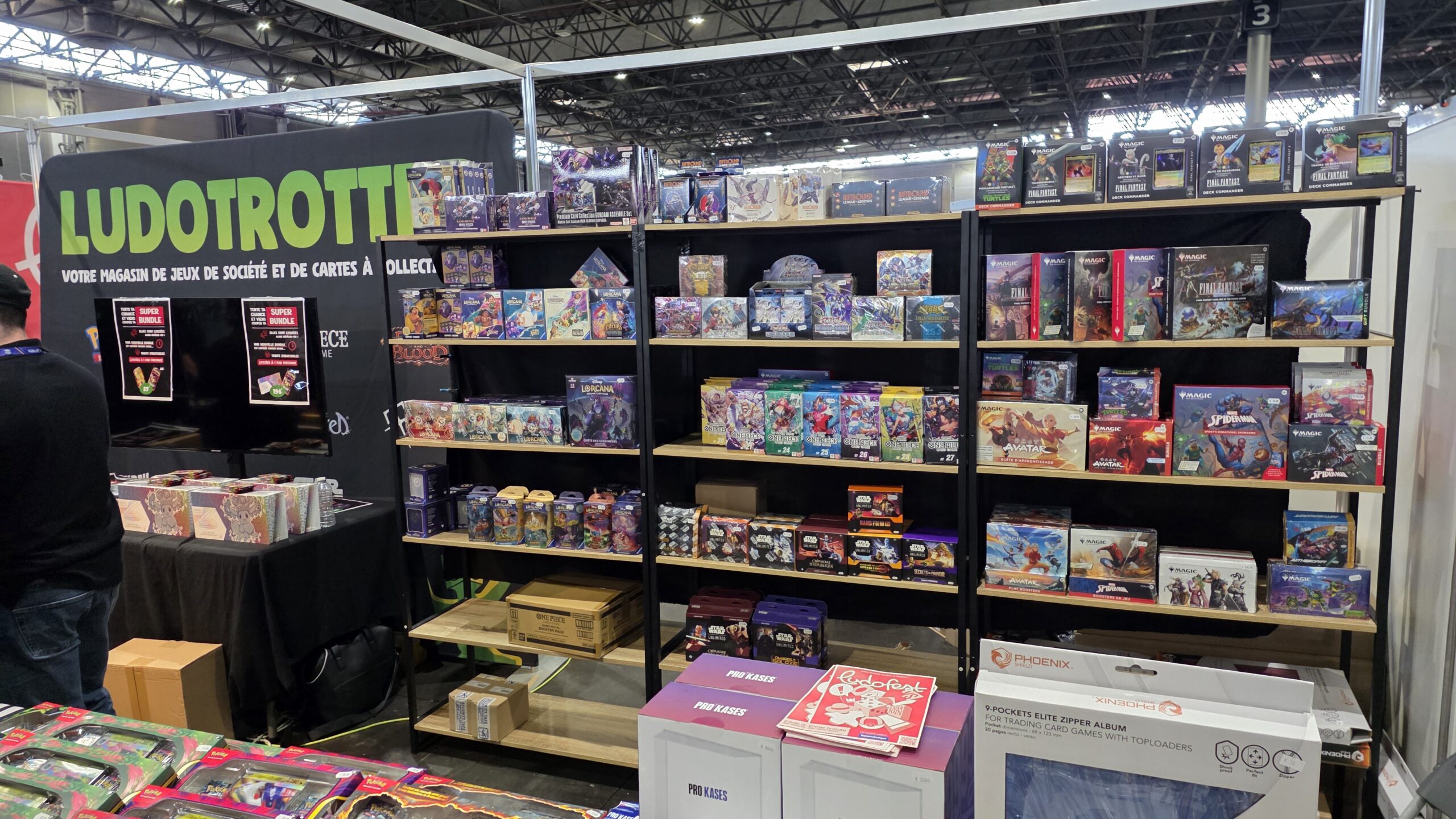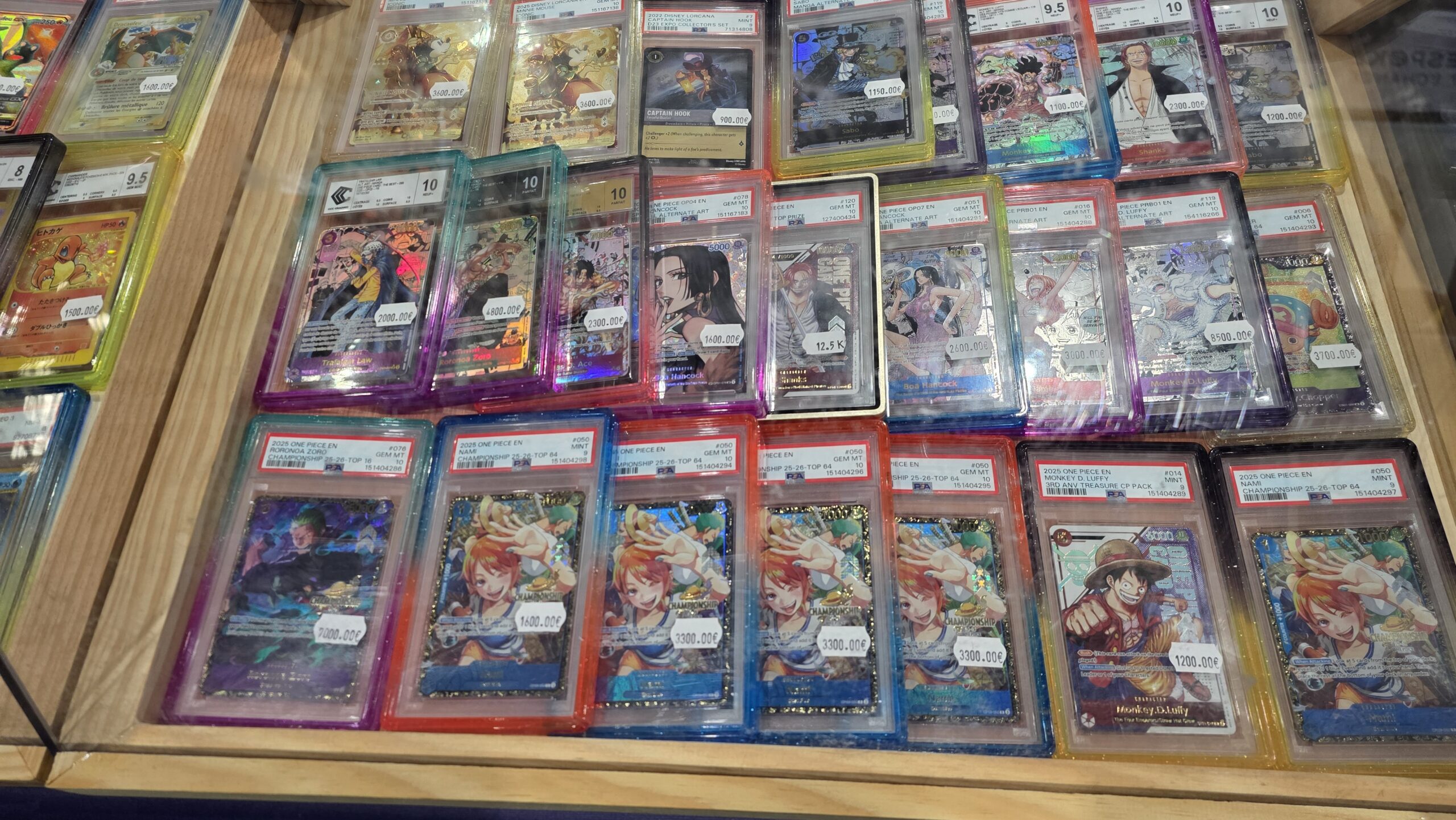 Le site annonce une centaine d’exposants mais l’écrasante majorité était des boutiques d’achat et vente de vos collections de cartes. Parmi les licences phares, Pokémon était sans grande surprise le grand leader. Mais les TCG One Piece, Magic et Lorcana n’étaient pas en reste. Je n’ai évidemment pas pris en photo chaque vitrine mais ci-dessous vous avez un bon aperçu de ce à quoi ressemblaient de nombreux stands.