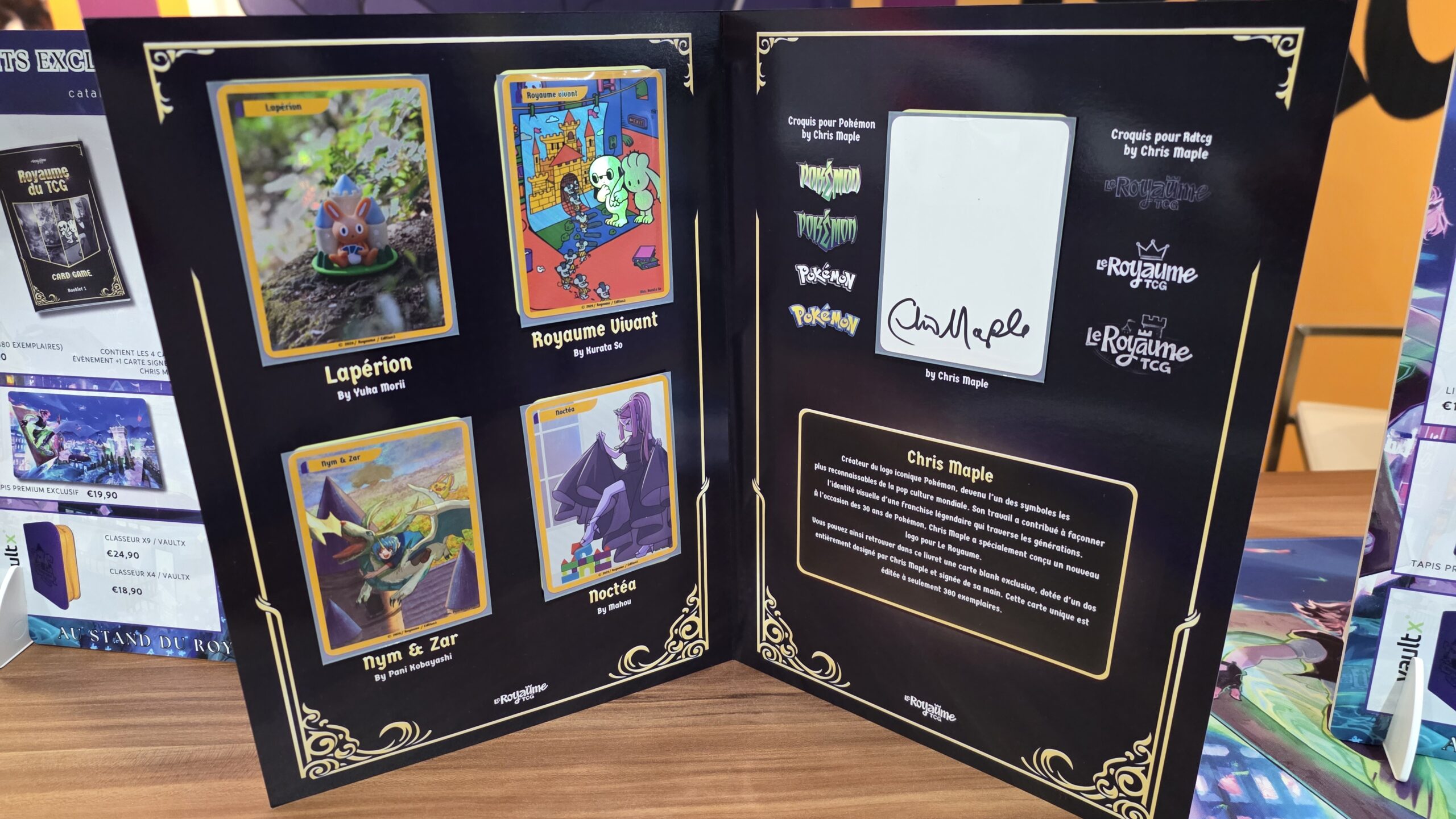 Le Royaume du TCG s’est associé à divers artistes pour créer des cartes exclusives en vente à la boutique du salon. Chris Maple qui a fait le logo Pokémon s’est quant à lui chargé du logo du salon.