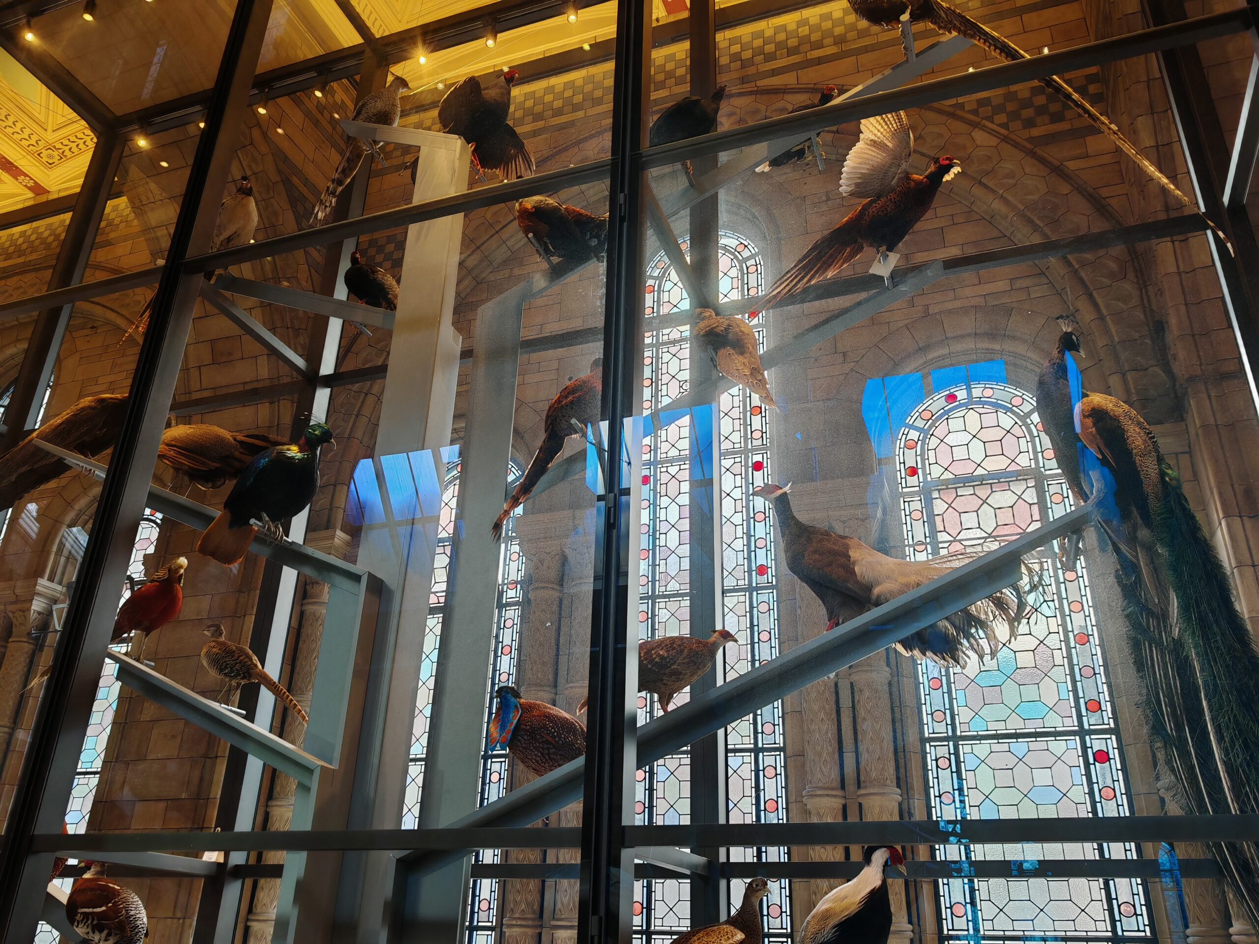 De nombreux oiseaux sont présents dans des vitrines particulièrement hautes.