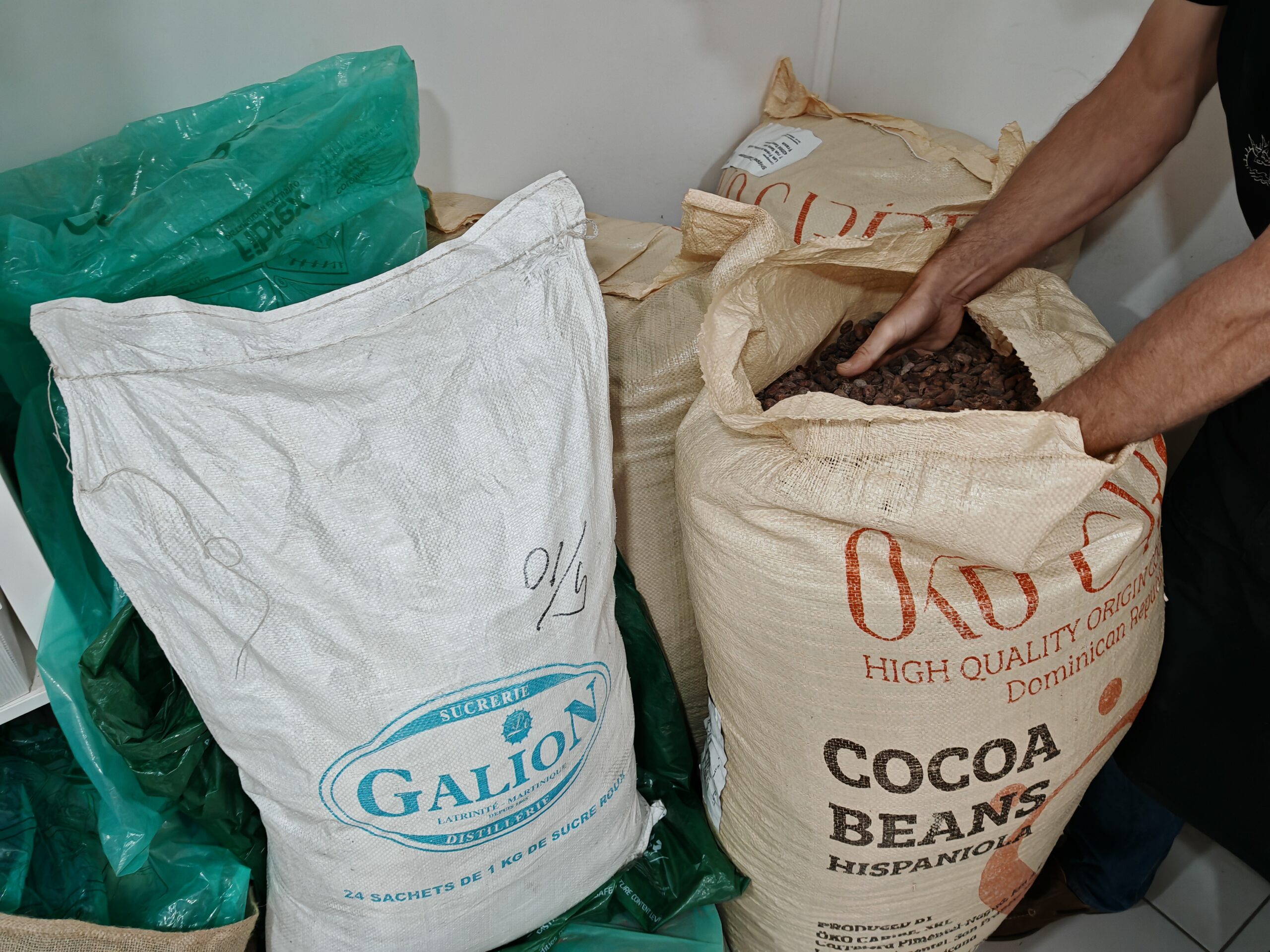 Dans sa petite échoppe joliment décorée, on observe derrière le comptoir la grande baie vitrée qui cache l’atelier de transformation des produits réceptionnés. L’occasion pour nous de découvrir le façonnage de tablettes de chocolat notamment.