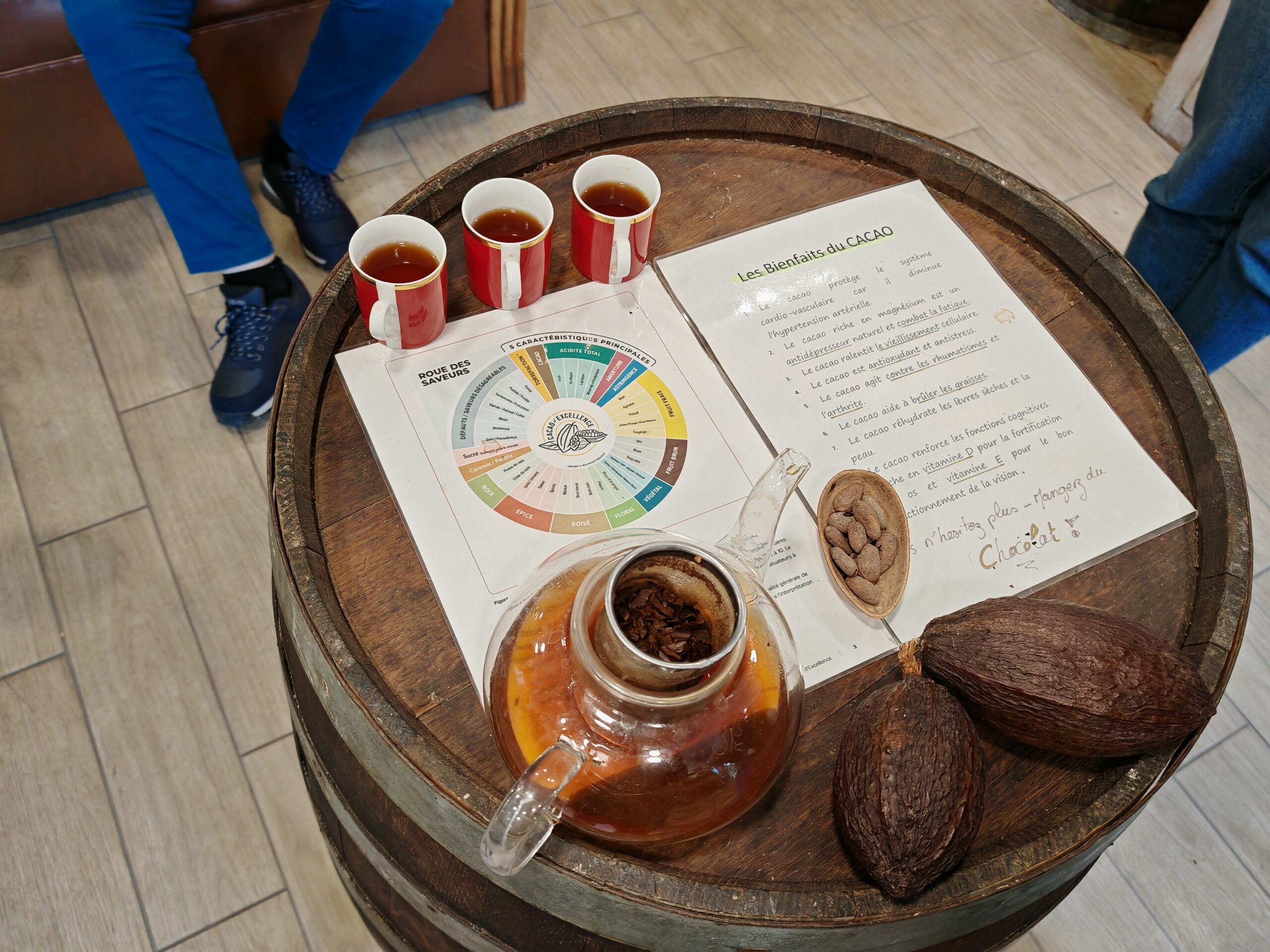 A peine arrivés, une infusion au cacao nous attendait. Elle est préparée à base des coques des fèves de l’or marron. La coque est séparée du gruet dans l’arrière boutique avec une machine homemade créée par Raphaël reliée par un aspirateur. Pour rappel, des aspirateurs j’en ai testé plusieurs ces derniers mois sur mon site.