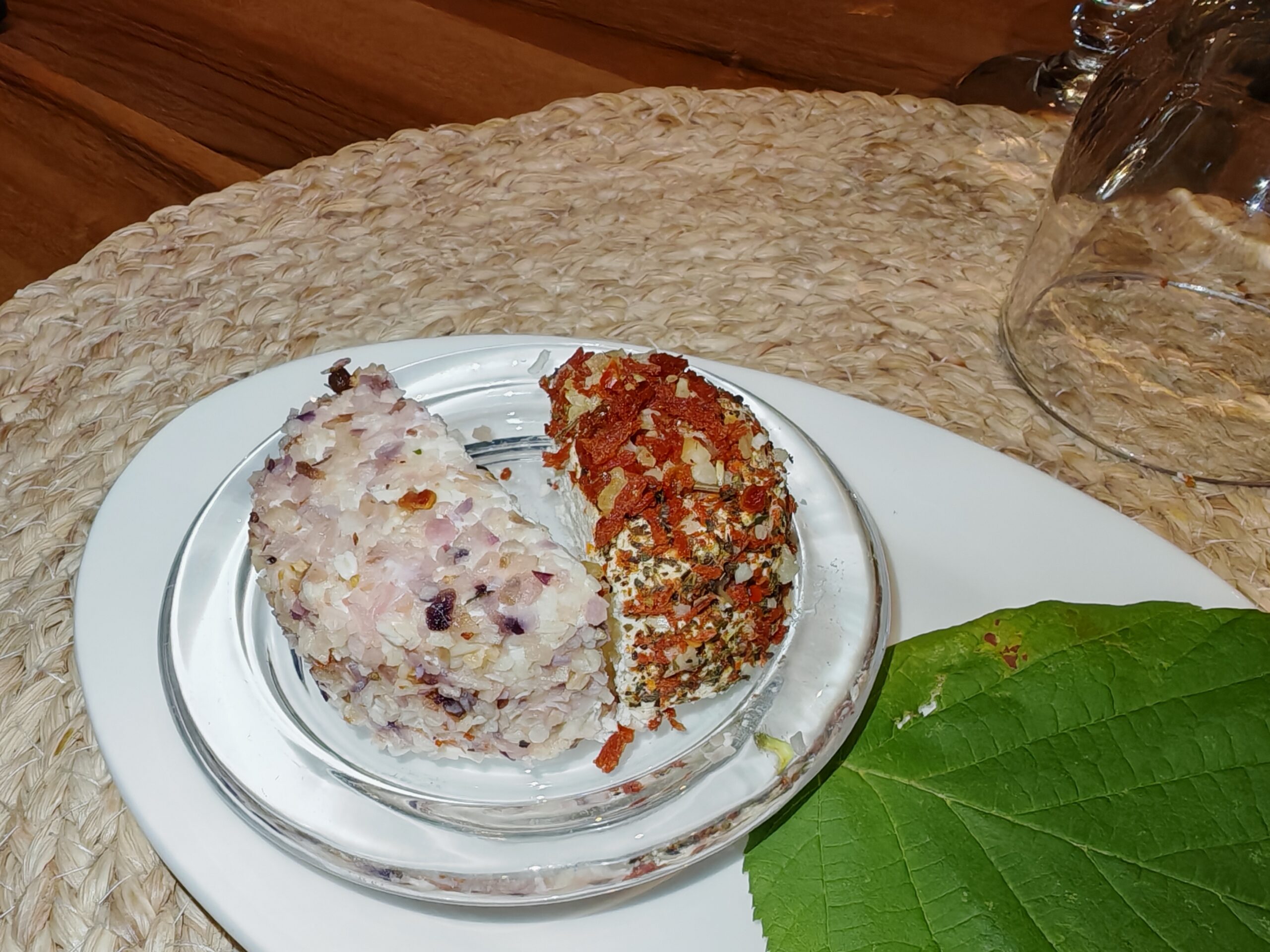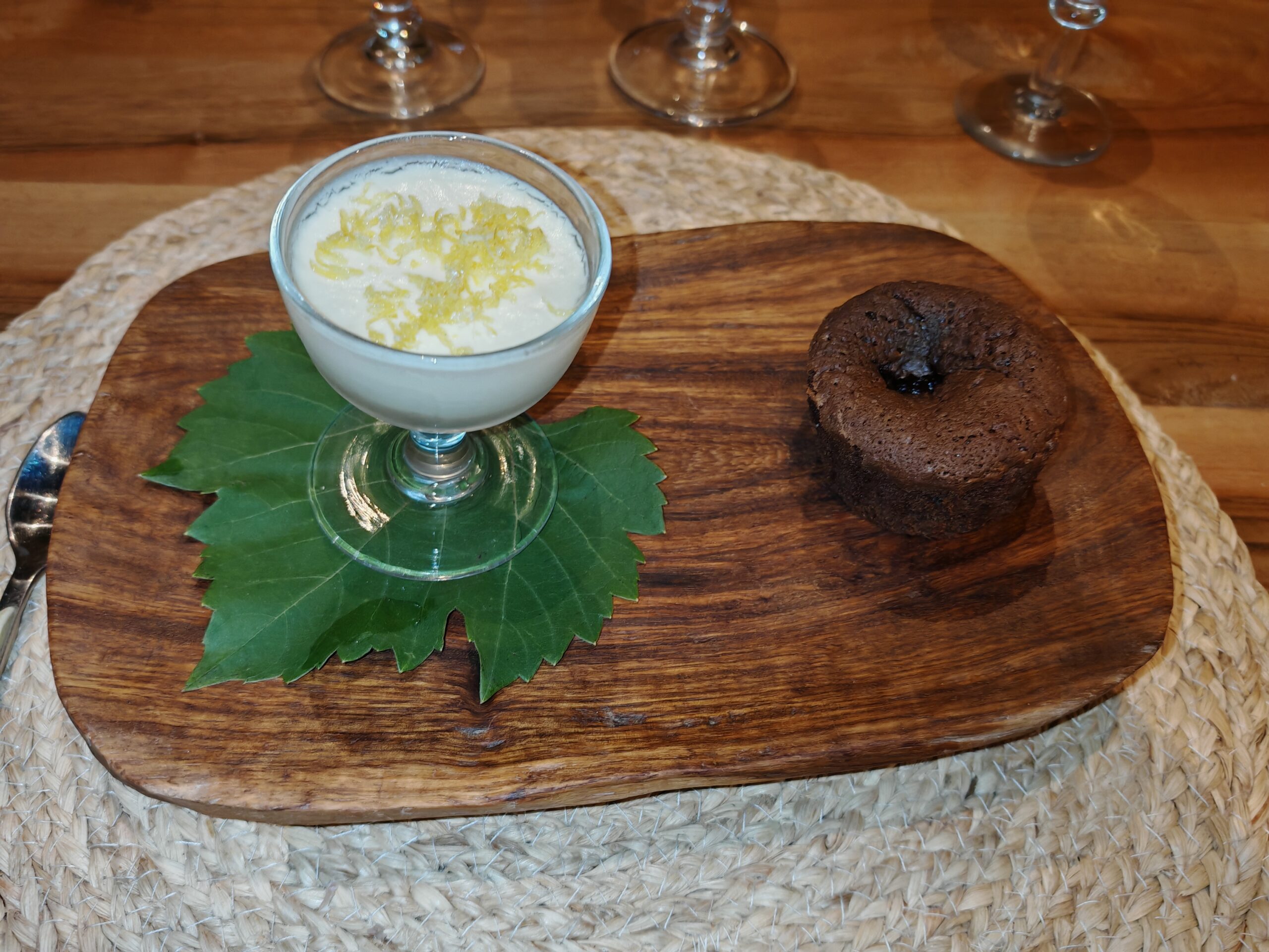 Vous pouvez voir que j’ai pu goûter une tapenade avec pain maison, des tartines de cèpes et la crême associée, un lieu agrémenté de courges, tomates, lentilles et fromage fouetté, des très mignons fromages individuels (qu’on a partagés) aux échalotes ou à la tomate et enfin une douceur sucrée avec une crème au citron et un fondant au chocolat.