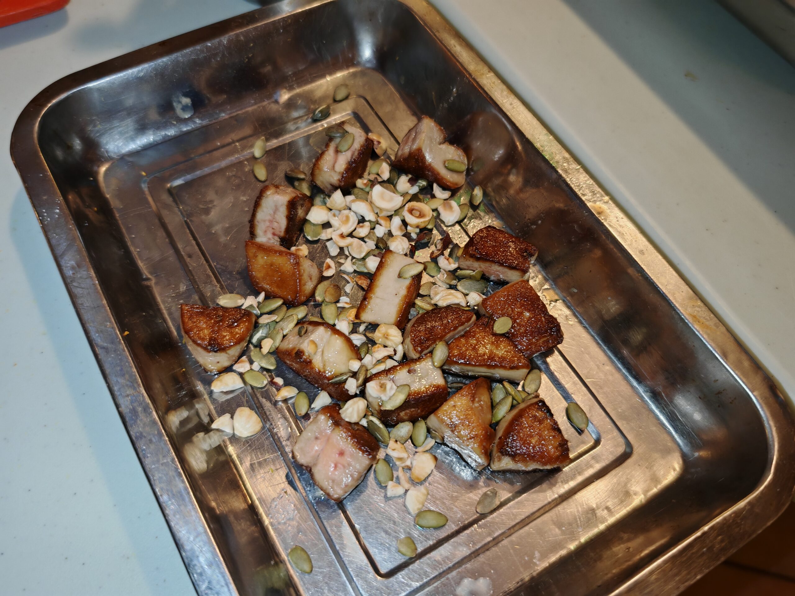 L’entrée était un mélange de textures avec le croquant des noisettes et graines de courge, le fondant du foie gras et le crémeux du velouté.