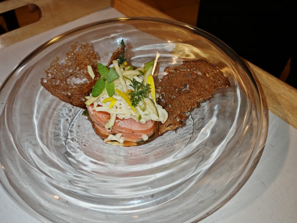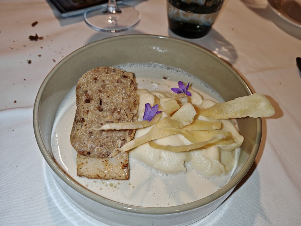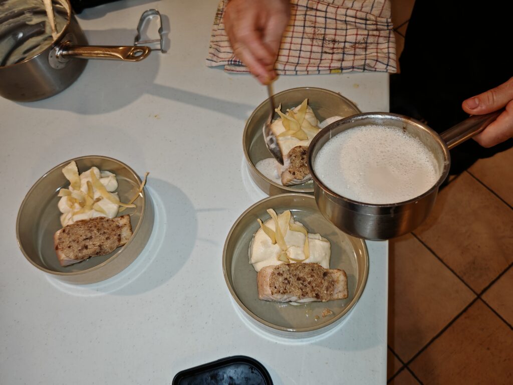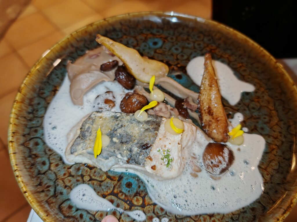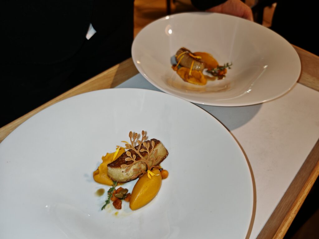 Pour l’esturgeon, on retrouve une chair particulièrement ferme, une sauce à la citronelle puissante en goût et une douceur sucrée de la croûte à la châtaigne et chapelure. On retrouve aussi du croquant avec les chips de panais et du crémeux avec la purée (que j’ai servie avec un peu trop de générosité si j’en crois nos hôtes du jour).