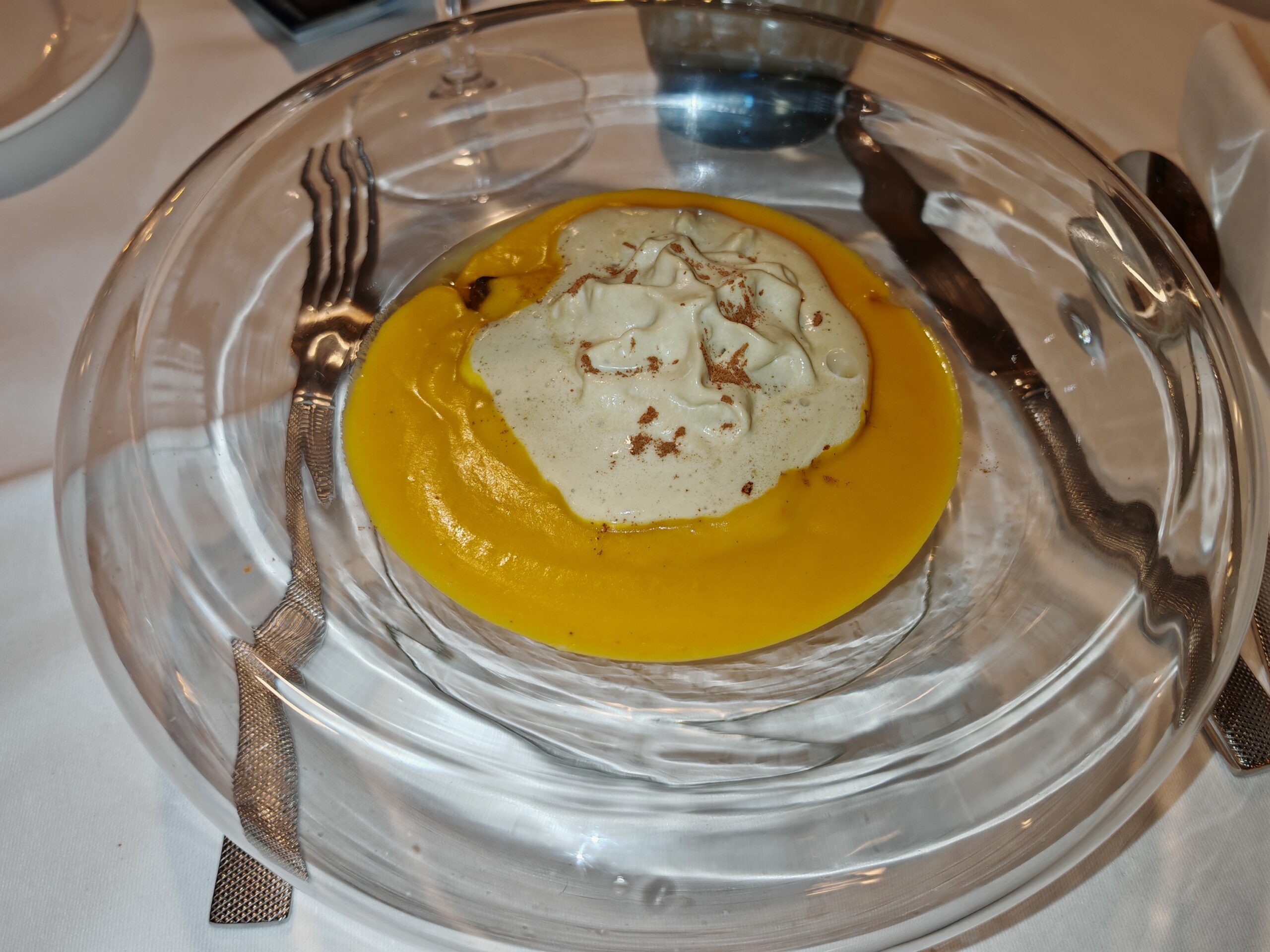 - Velouté au potimarron, éclats de foie gras poelé, chantilly à l’huile de pépins de courge
