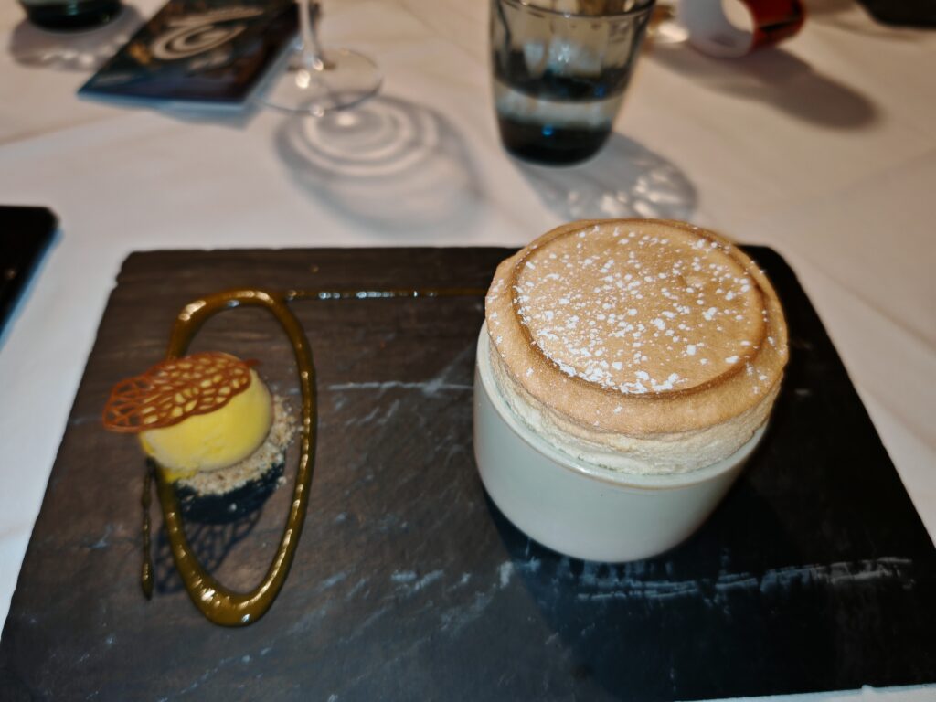 Je ne connaissais pas du tout le soufflé. Imbibé de cognac local, ça m’a rappelé le baba au rhum. C’est le dessert signature des lieux. Mangez une petite partie du soufflé puis plongez la boule de glace en son sein pour créer un choc de températures.