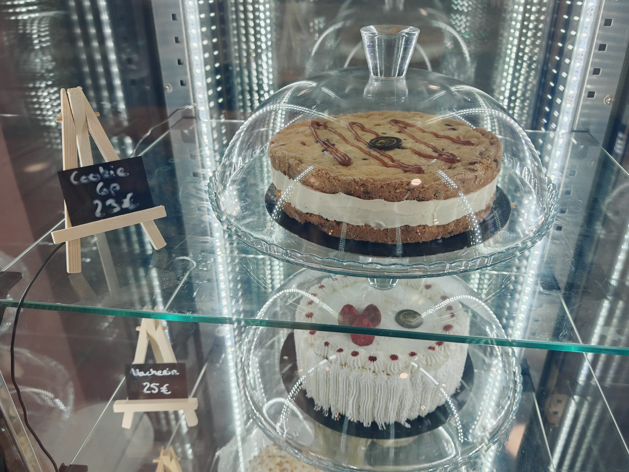 Les glaces sont crémeuses et pas trop sucrées. Petit regret de ne pas avoir vu la proposition de cookie glacé avant mon choix. C’est proposé à la vente en part individuelle et en gâteau à partager.